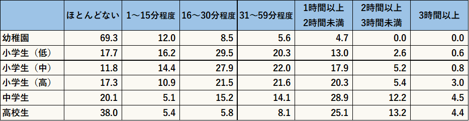 スマートフォン・携帯電話の使用時間も年齢が上がるにつれて大きく増加するものの、幼稚園児でも、36.3%がスマートフォンや携帯電話を使用していることがわかった。小学生では学年が上がるにつれて使用時間が増え、高学年になるとさらに増加する。中学生では2時間以上が48.1%、3時間以上が19.4%と急増し、高校生では3時間以上が41.4%まで増加した。
