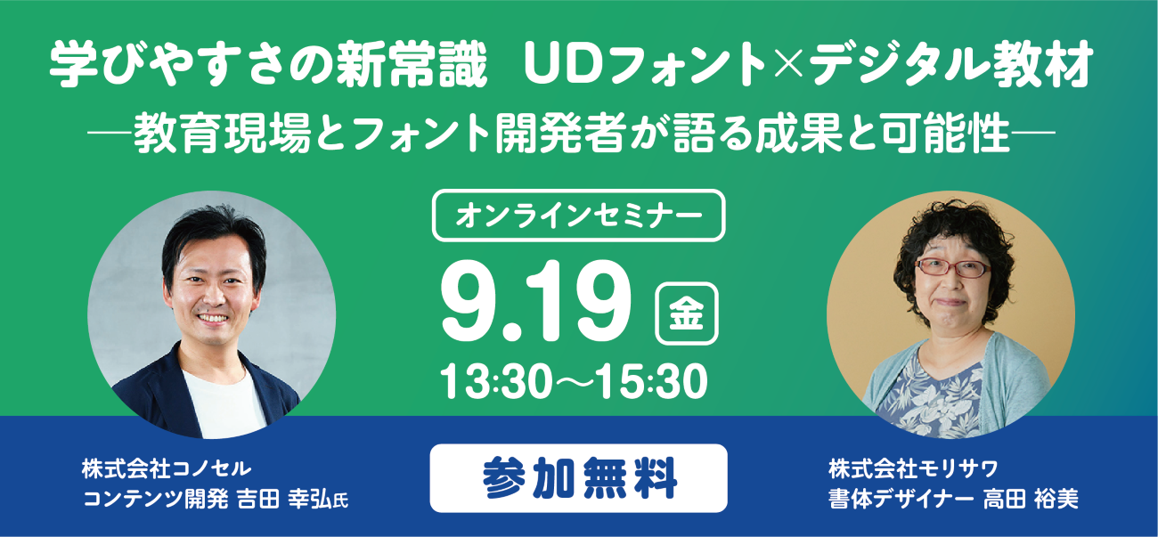 モリサワは、教材・教育サービスの制作に関わる人向けに無料オンラインセミナー「学びやすさの新常識 UDフォント×デジタル教材 ―教育現場とフォント開発者が語る成果と可能性―」を、9月19日に開催する。参加費は無料。