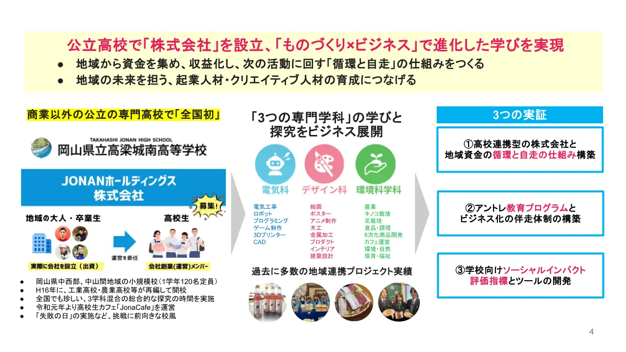 JONANホールディングスは、商品の企画販売、ワークショップやイベント企画運営、デザイン科のクリエイティブ力を活かしたデザイン制作などの事業を展開する予定。これにより、ものづくり系の専門高校の高校生でも、経営・会計・マーケティングなどを実践的に学ぶ機会を得ることができる。さらに、将来のキャリア形成、地域社会への貢献につなげていく。
