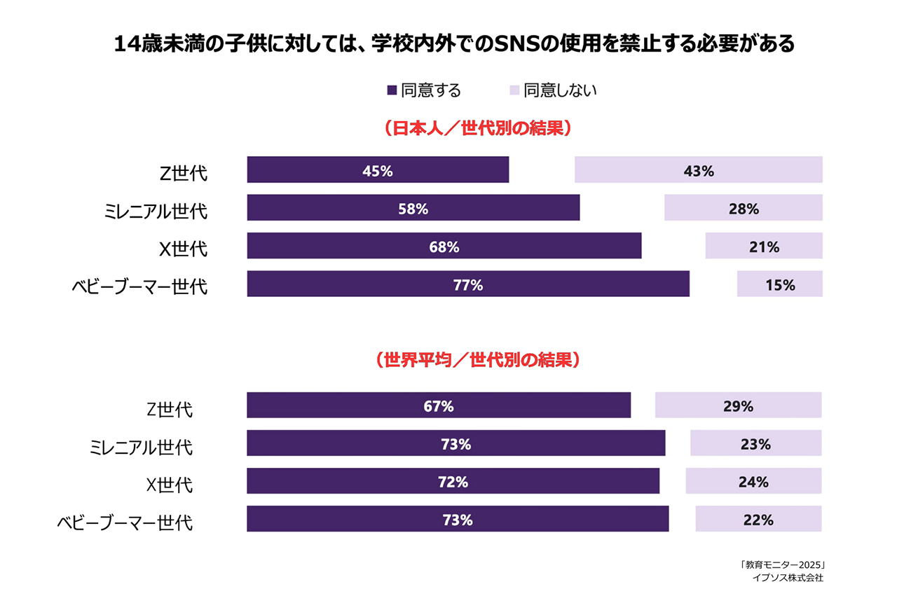 14歳未満の子どもに対しては、学校内外でのSNSの使用を禁止する必要があるかを尋ねた質問では、「禁止する必要がある」(同意する)と答えた日本人は63%だった。