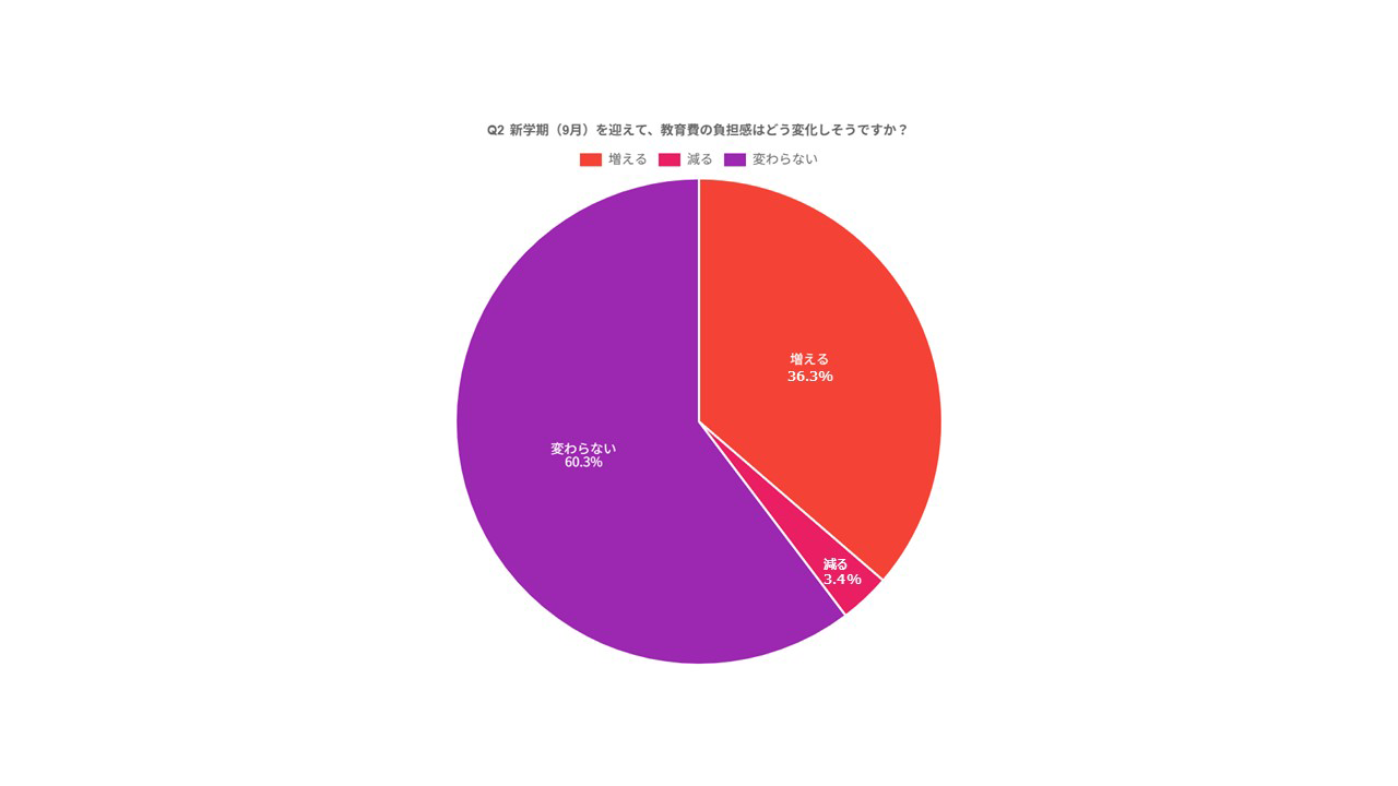 新学期(9月)を迎えて、教育費の負担感はどう変化しそうかを尋ねた質問では、「教育費が増える」という回答は36.3%となった。「教育費が減る」とする回答は3.4%に留まっている。