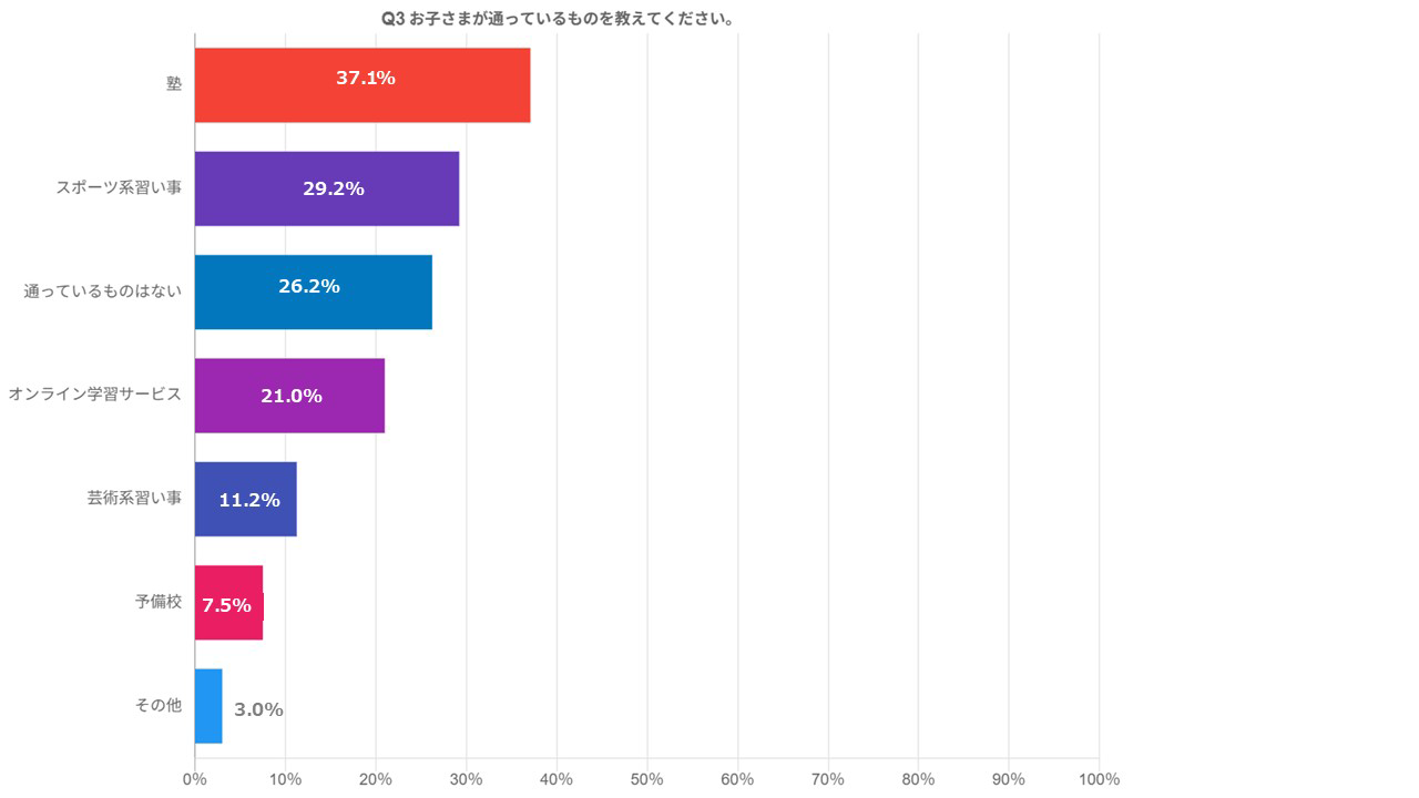現在、自身の子どもが通っている教育・習い事としては(複数回答)、「塾」(37.1%)が最多となり、「スポーツ系習い事」(29.2%)、「オンライン学習サービス」(21.0%)が続いた。