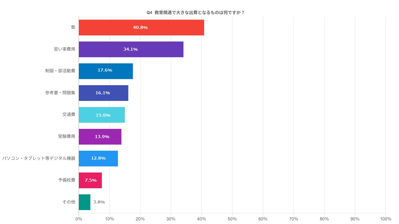 教育関連で大きな出費となるものを尋ねたところ(複数回答)、「塾」(40.8%)と「習い事費用」(34.1%)が上位を占めている。