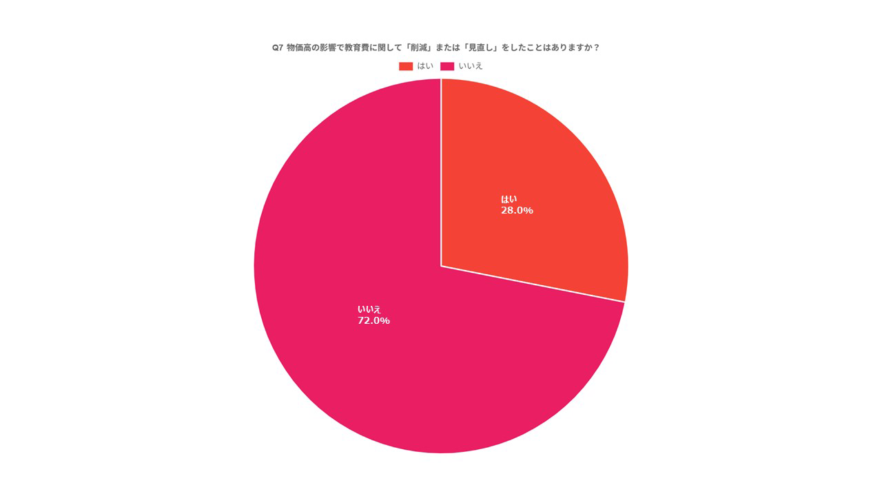 物価高の影響で、教育費に関して「削減」または「見直し」をしたことがあるかを尋ねた質問では、「ある」とする回答が28.0%を占めた。「削減」または「見直し」をした教育費としては、「塾や習い事」が中心となっている。