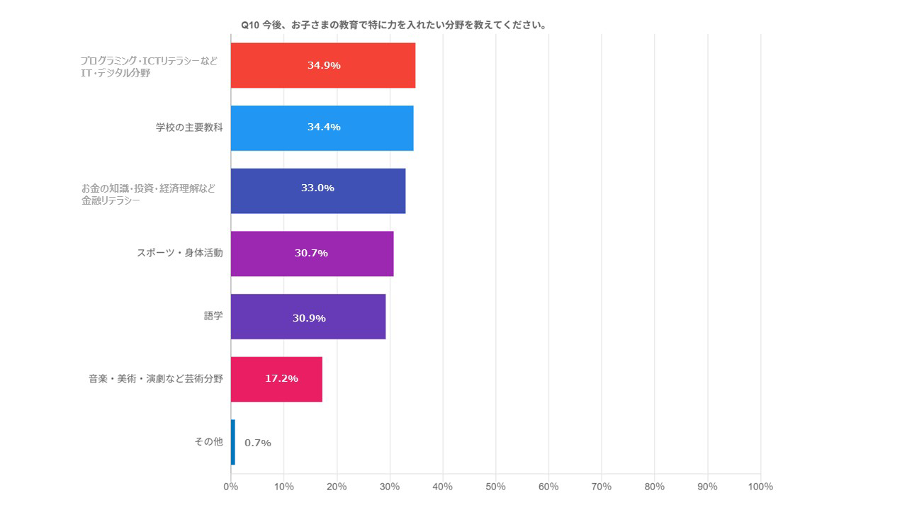 今後、自身の子どもの教育において、特に力を入れたい分野を尋ねた質問(複数回答)では、「プログラミング・ICTリテラシーなどIT・デジタル分野」(34.9%)がもっとも多く、「学校の主要教科」(34.4%)、「お金の知識・投資・経済理解など金融リテラシー」(33.0%)がそれに続いた。