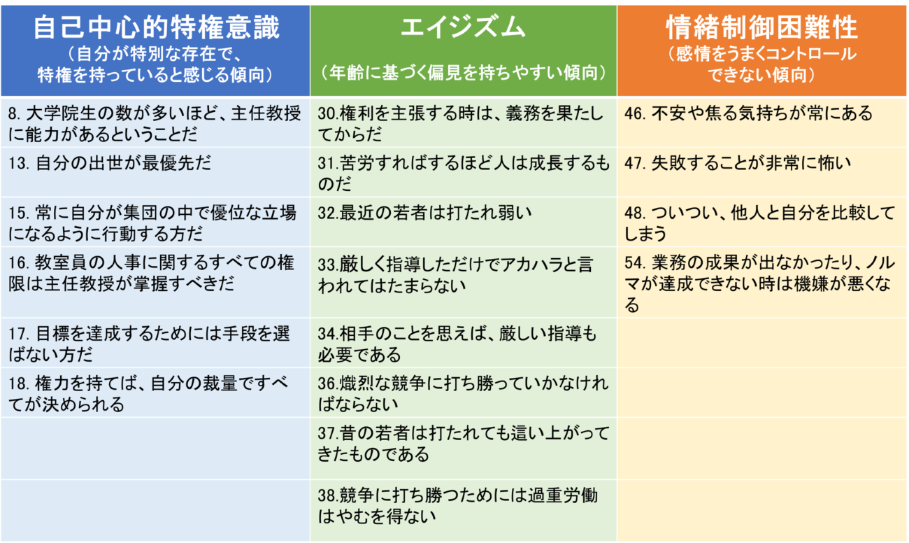 同研究では、書籍や論文をもとに、アカハラやパワーハラスメント加害者の心理傾向に関する質問項目を作成した。その後、まず、理系学部の研究者55名を対象に予備調査を行い、141項目からなる尺度原案を作成した。次に、理系学部の大学院生や教員500名を対象に同調査を実施した。データを因子分析した結果、加害者の心理傾向は「自己中心的特権意識」「エイジズム」「情緒制御困難性」の3つの因子に大別されることがわかった。これらの因子を最終的な「アカデミック・ハラスメント傾向尺度」とした。合わせて、この尺度が信頼性、妥当性を有していることも実証した。