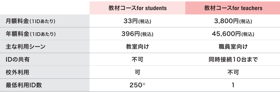 今回、学校向けに販売中の「教材コース」を「教材コース for teachers」に名称変更し、「教材コース for students」を新設する。職員室向けの「for teachers」は学校内限定で一つのIDを同時に10台まで複数名で利用できる。「for students」は1人ずつにIDを発行し、個別のタブレットやPCで閲覧できるので自宅学習にも利用可能。