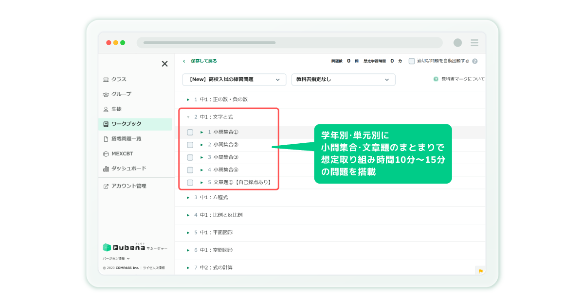 COMPASSは、同社が提供する学習eポータル+AI型教材「キュビナ」の新コンテンツとして、実際の高校入試の問題で子どもたち自身が自律的に応用問題演習に取り組むことができる「高校入試の練習問題」をリリースしたことを、10月8日に発表した。同コンテンツの対象教科は数学で、学年別・単元別の目次で実際の高校入試の問題を搭載し、知識の活用力・思考力を高めるトレーニングとして日々の学習に活用できる。