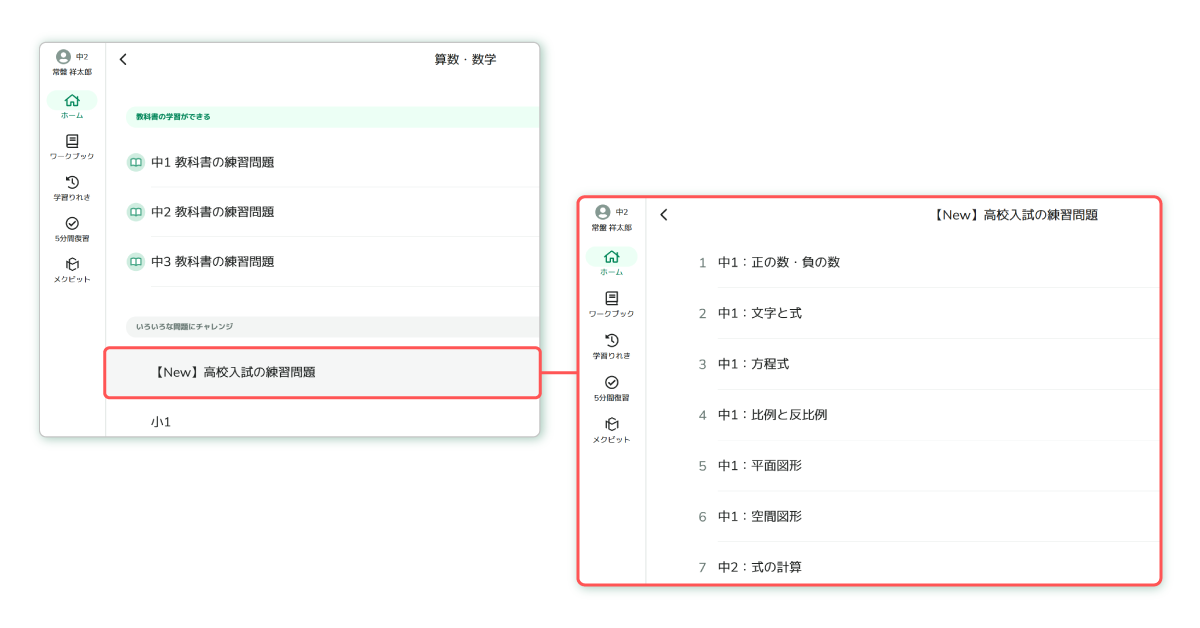「ワークブック」機能で教員が問題を指定して配信するほか、子どもたちの学習画面の目次から「高校入試の練習問題」に取り組むことができる。教科書の問題を解き終えた後の力試しなど、さらに問題を解きたいという子どもたちの意欲に応える。