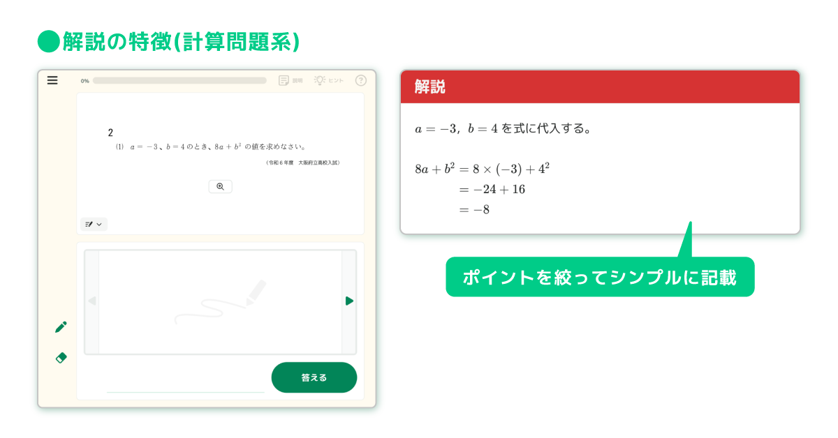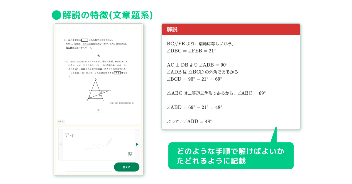 また、6月にリリースした高校入試の過去問題では、高校入試の実戦演習を想定し、教員による指定配信に限定したコンテンツ仕様になっているが、新コンテンツの高校入試の練習問題では、教員による指定配信だけでなく、子どもたちの学習画面から子どもたち自身が問題を選んで取り組むことが可能。さらに、問題ごとにわかりやすい解説を搭載し、子どもたちによる自律的な力試しの機会として活用できる。
