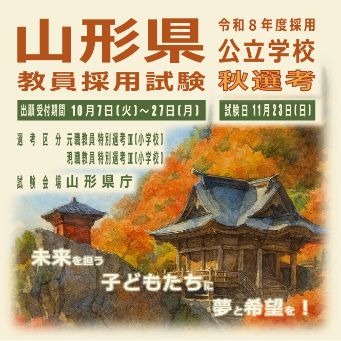 山形県教育委員会は、他県から「山形県へ戻りたい」「山形県へ移住したい」と考えている教員のニーズに応えるため、令和8年度採用山形県公立学校教員選考試験の秋選考を、今年度、初めて実施する。