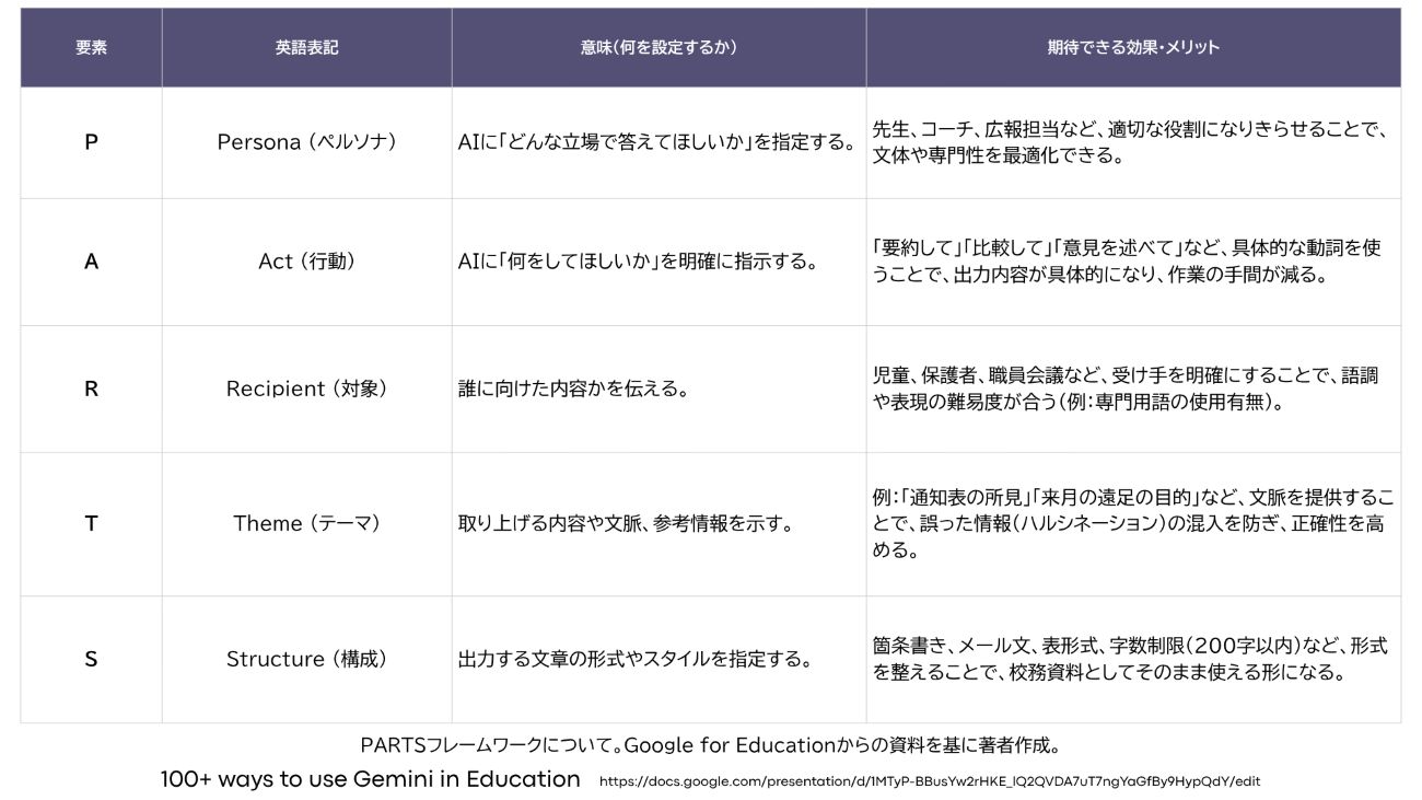 以下がPARTSフレームワークについてまとめた表だよ。「どんな人として、何を、誰に、どんなテーマで、どんな形で」出してほしいかを伝えるものなんだ。この5つを意識するだけで、AIの出力が格段によくなるよ