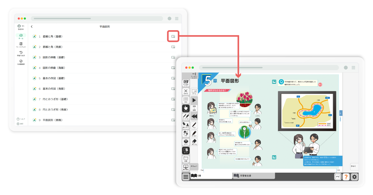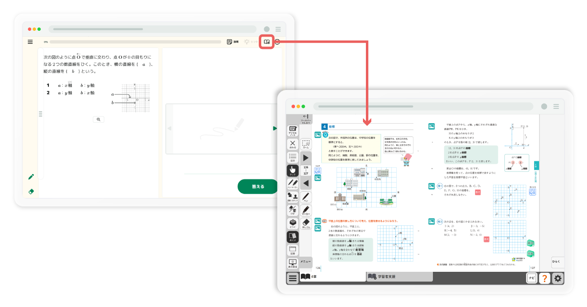 キュビナの問題画面に表示された教科書のアイコンをタップすることで、対応するデジタル教科書の該当ページにジャンプし、教科書で学習することができる。一つひとつの問題だけではなく、問題一覧画面や問題グループのトップ画面からも、デジタル教科書へ連携している。