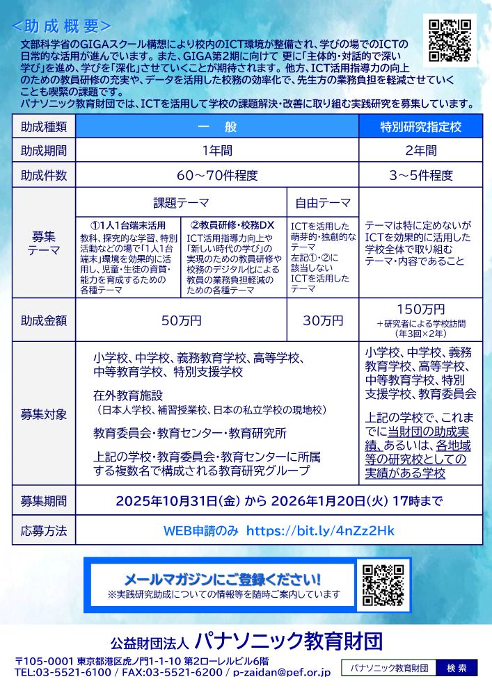 なお、「2026年度(第52回)実践研究助成」の応募受け付け開始にあわせて、「実践研究助成説明セミナー」をオンライン開催する。開催日時は、「特別研究指定校」向けが11月20日16時から、「一般」向けが11月27日16時からとなり、それぞれ専用ページからの事前申し込みが必要。