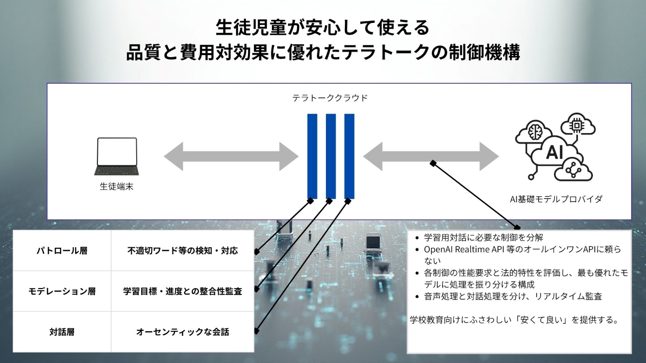 テラトークは、生成AIの教育現場、特に児童生徒による利用に向けた各種ガイドラインや、生成AIの基幹モデル開発各社の利用規約に基づき、技術・法務の両面で教育現場の安心・安全が守られるよう設計されている。また、教員の働き方改革が教育行政の大きなテーマとなる中、低負担で授業に導入できる製品とするため、学習指導要領や「Can-Doリスト」を基盤に同社で設計した会話シーンを約30本(2025年10月17日時点)プレインストールしている。