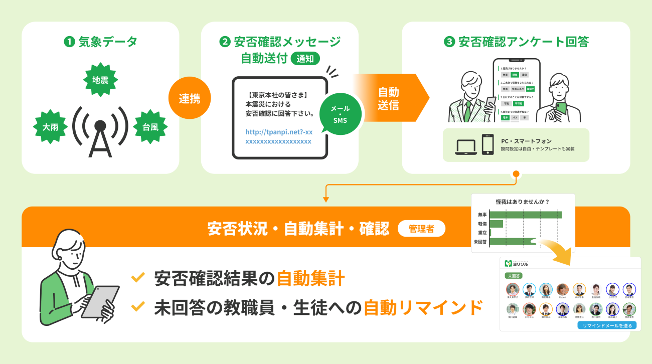 このような課題に対応するため、ヨリソルでは、気象警報と連携して安否確認通知を自動化する新機能を開発した。同機能により、災害発生時の初動対応を迅速化し、安否状況をリアルタイムで把握できるようになることで、教員の負担を軽減し、学校全体の事業継続計画(BCP)対策を支援する。また、ヨリソルはスマートフォンアプリにも対応しており、LINEやアプリプッシュ通知を活用することで、生徒および教員の状況を迅速かつ正確に伝達し、安心を提供する。