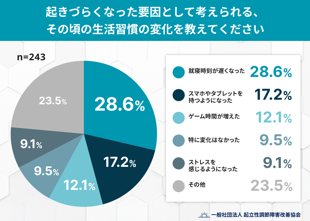 子どもが起きづらくなった要因として考えられる生活習慣の変化を尋ねたところ、「就寝時刻が遅くなった」が約3割でもっとも多く、「スマホやタブレットを持つようになった」(17.2%)をはじめとする、夜型化を招く生活習慣が上位を占めた。一方で、「ストレス」「習い事・塾」といった、心理的・環境的負担を挙げる回答もあった。