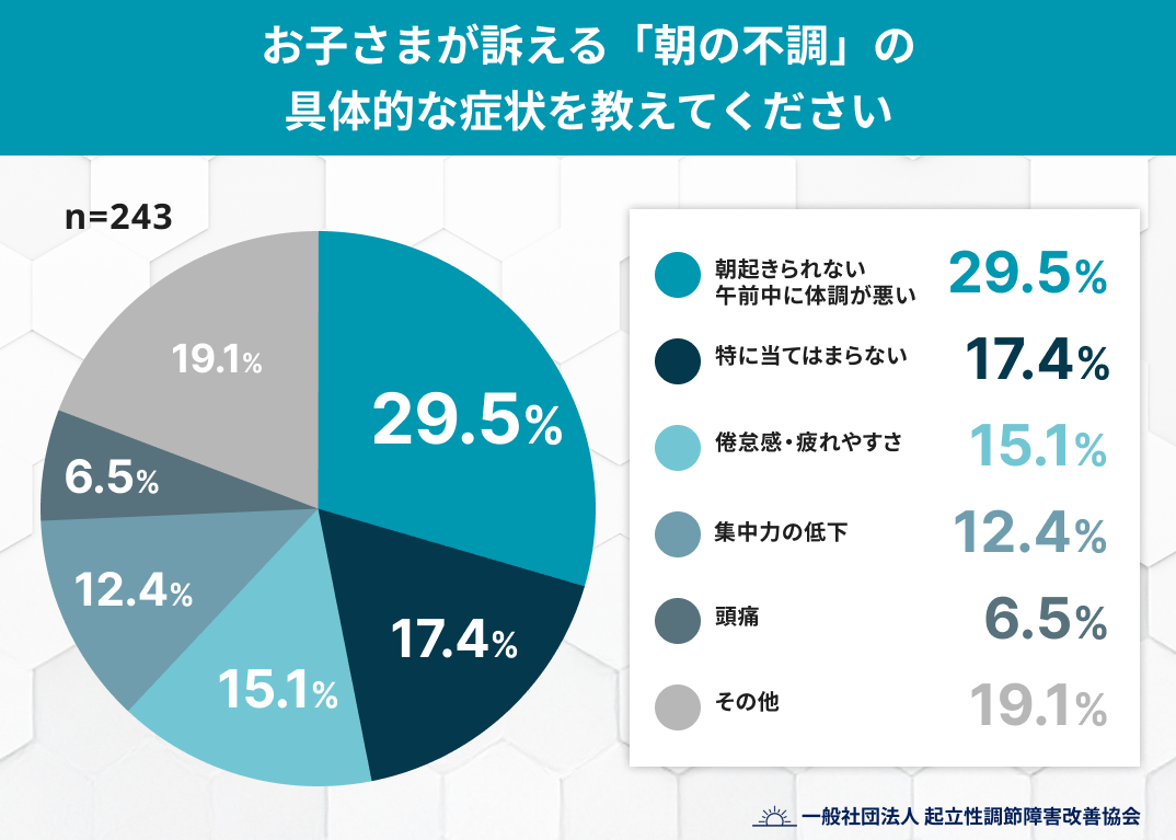 起立性調節障害改善協会は、小学生~高校生の子どもを持つ保護者を対象に実施した、「子どもの朝の不調」に関するアンケート調査の結果を10月29日に発表した。同調査は10月25日~28日の期間に行われ、243名から回答を得ている。