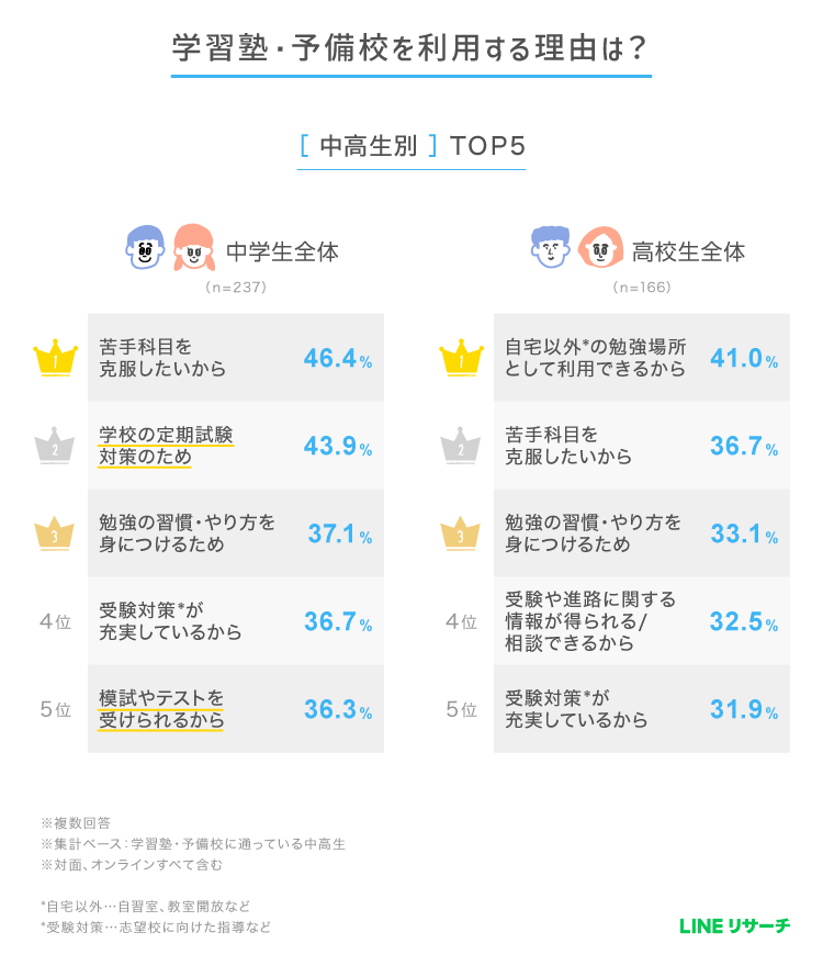 LINEヤフーは、同社の運営するスマートフォン専用リサーチプラットフォーム「LINEリサーチ」による、全国の中高生を対象とした塾・予備校など学校外での学習状況や進路に関する調査の結果を10月30日に発表した。同調査は、9月22日〜24日の期間に行われ、1030件の有効回答を得ている。