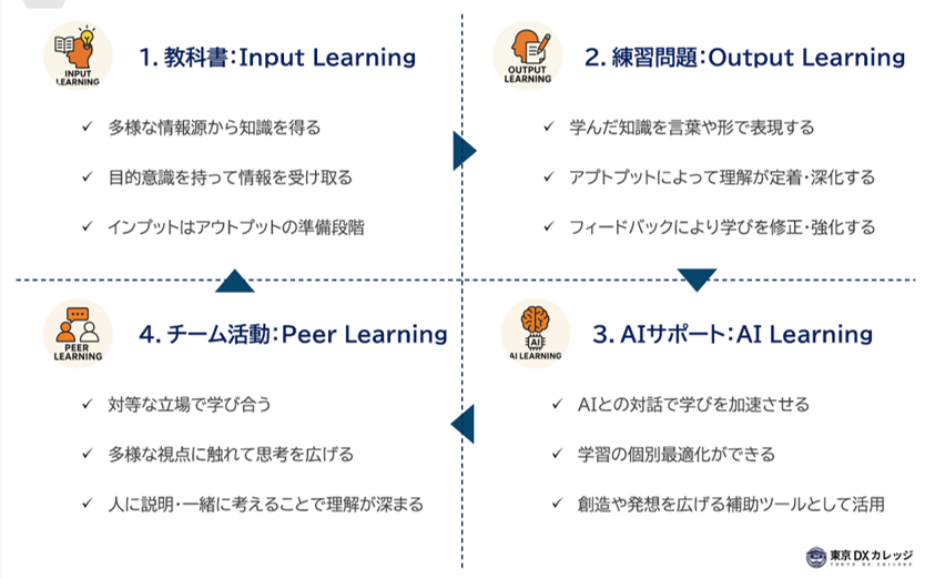 チーム活動での学習に対応しており、教科書を通じたインプットや練習問題を通じたアウトプット、AIによるサポートと共に、学び合いを通じて理解を深め、知識の定着を促進する。