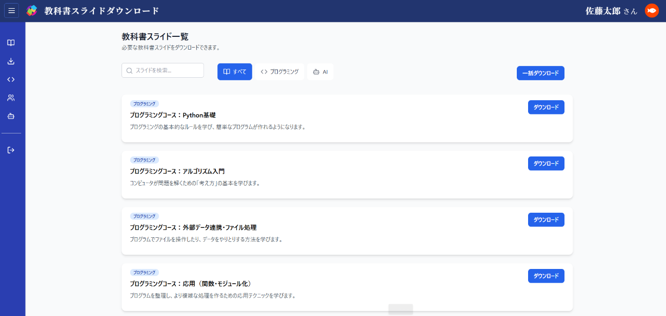 小学校・中学校の探究学習で使用する場合、「生成AI入門」「情報リテラシー」など授業にそのまま使える教科書スライドのダウンロードが可能。また、高校の新設科目である「情報Ⅱ」については、授業でそのまま使える教科書スライドに加え、4つのコースに分かれた年間授業計画とルーブリックも使用できる。これにより、授業計画の策定に苦慮する教員の負担軽減をサポートする。