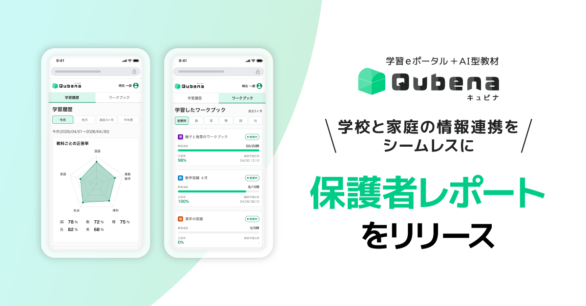 同サービスにて表示されるデータは、教員用の管理画面「キュビナ マネージャー」でも同形式で確認が可能なので、学校・家庭間のシームレスな情報連携を実現する。教員にとっては、データの取りまとめや保護者向けの資料作成を行う必要がなく、いつでも同じ情報を共有できるようになる。