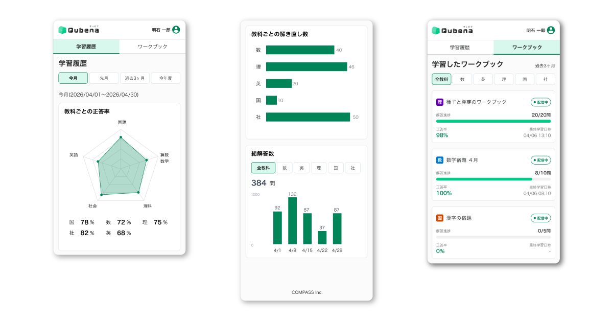 画面構成としては、保護者の見取りの鍵となる情報として、「キュビナ」に保存されている多様な学習データの中から、教科ごとの正答率・解き直し数・総解答数、および家庭学習での利用も多いワークブックの取り組みに関するデータをピックアップする。これにより、児童生徒一人ひとりの学習への取り組み状況や、得意・不得意の傾向をグラフでわかりやすく可視化する。また、レーダーチャートや積み上げ棒グラフといった各データに応じたわかりやすいグラフと、シンプルな画面構成および操作性によって、学習データに触れる機会の少ない保護者でも直感的に利用できる。