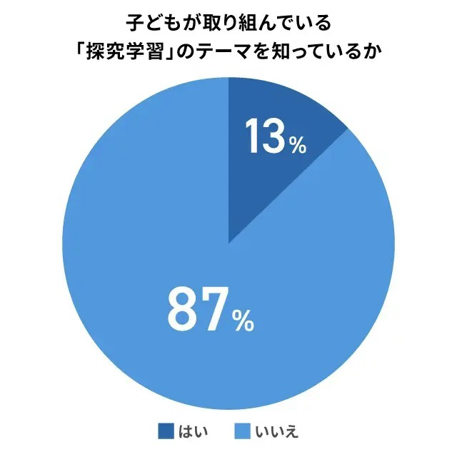 自身の子どもが取り組んでいる、「探究学習」のテーマを知っているかを尋ねたところ、「知っている」という回答は13%に留まった。