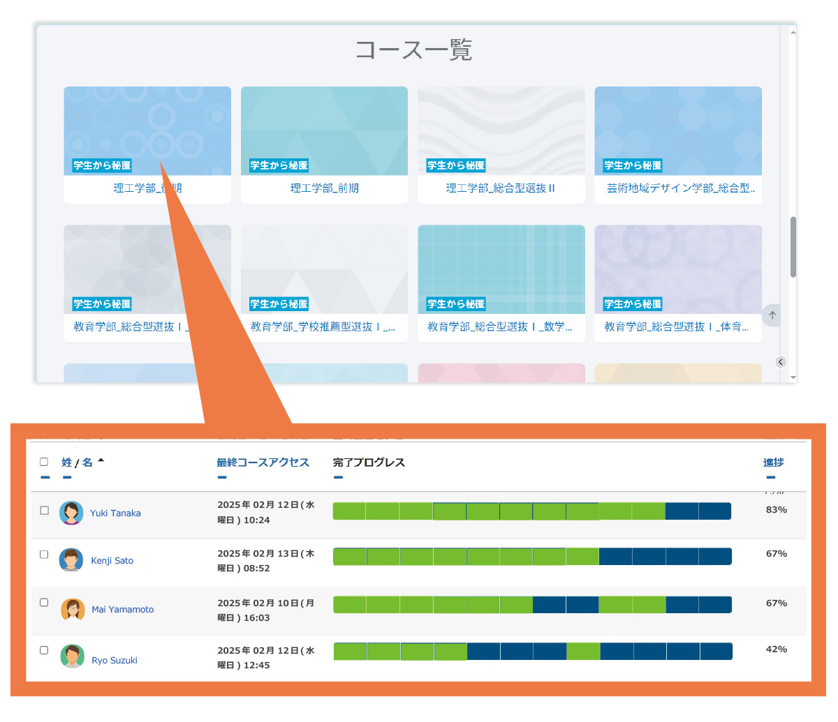 さらに、受講者の進捗把握や適切なフォローも容易であり、「Open LMS」の「完了プログレス」機能によって学部教員も把握が可能。入学前教育プログラムへのより深い理解や協力を得やすくなったという。