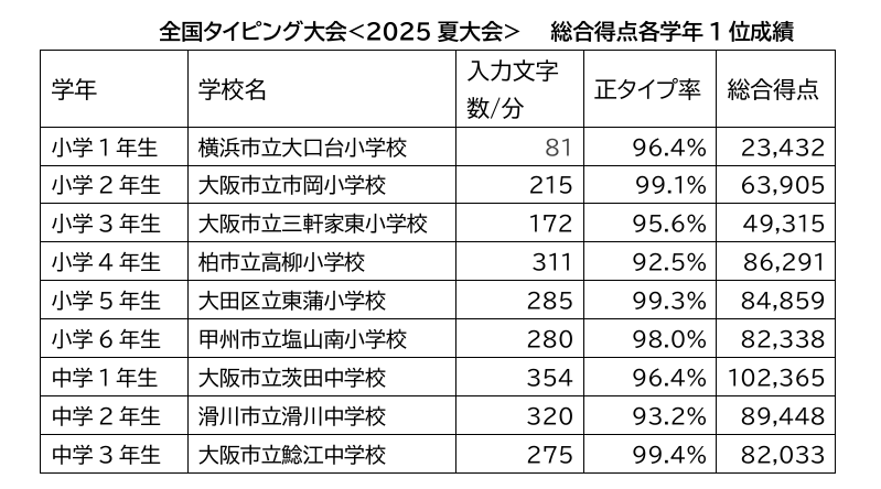 今回の大会では、1分間あたりの入力文字数300文字を超えるスコアをマークした児童生徒が全体で4名に達した。小学4年生のなかで1位となった児童のスコアが311文字を記録するなど、上位入賞者のレベルアップが目立っている。