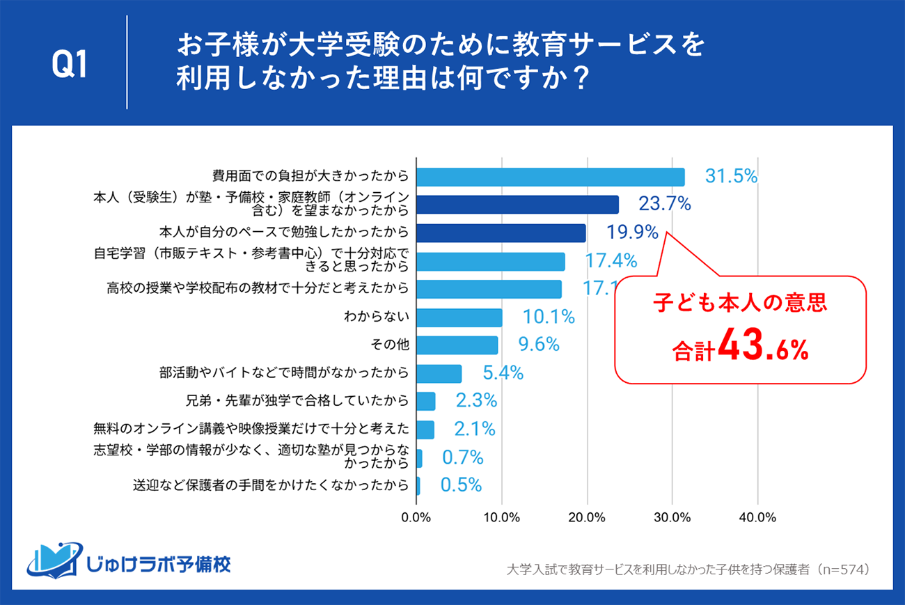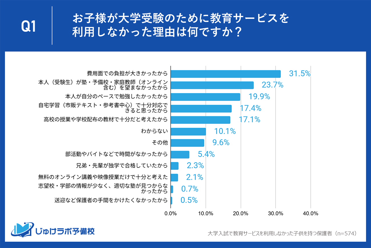 調査対象者に、自身の子どもが大学受験のために教育サービスを利用しなかった理由を尋ねたところ(複数回答)、「費用面での負担が大きかったから」(31.5%)がもっとも多かった。「本人(受験生)が塾・予備校などを望まなかったから」(23.7%)、「本人が自分のペースで勉強したかったから」(19.9%)がそれに続いた。
