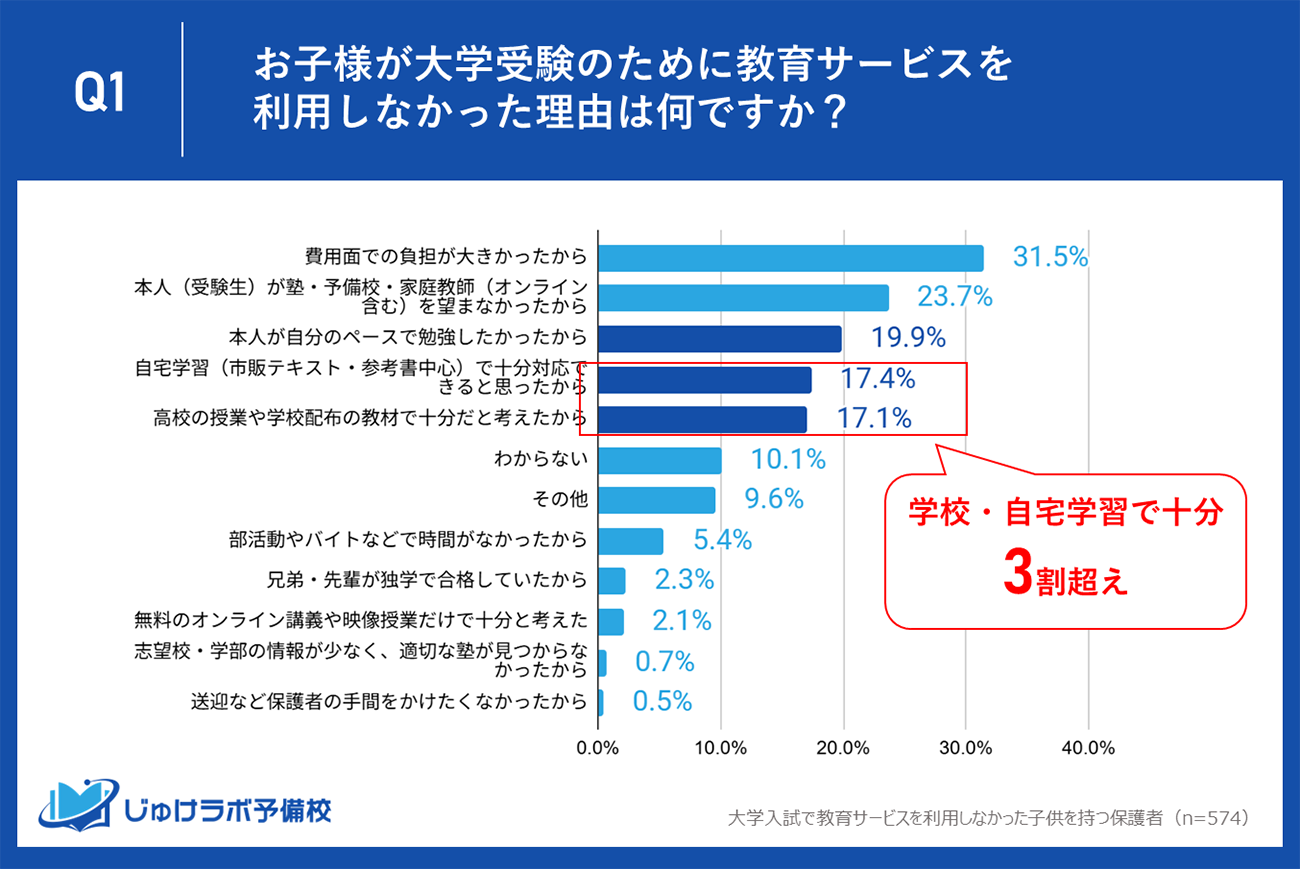 エンライクが運営する「じゅけラボ予備校」は、大学生の子どもを持つ保護者に対し、塾や予備校といった大学入試対策の教育サービス利用の有無と合格した大学についての調査を実施した。その中で、自身の子どもが教育サービスを「利用しなかった」と回答した574名を対象に、利用しなかった理由に関するアンケート調査の結果を11月17日に発表した。同調査は、8月8日〜9月20日の期間に行われている。