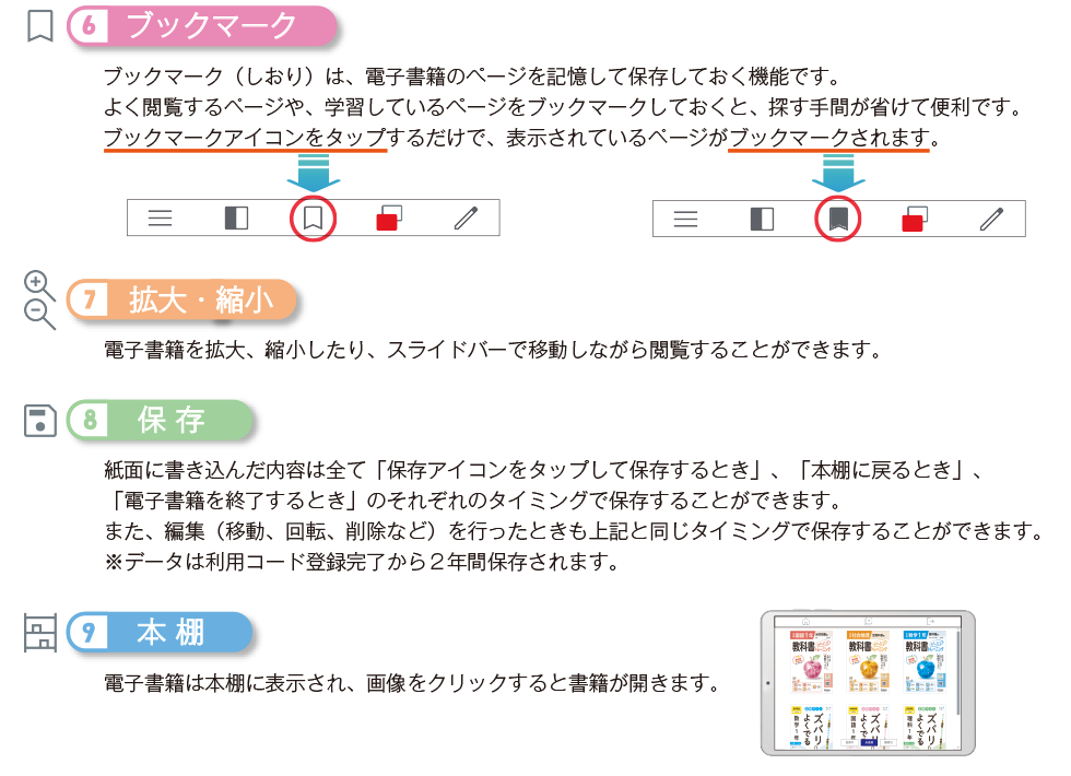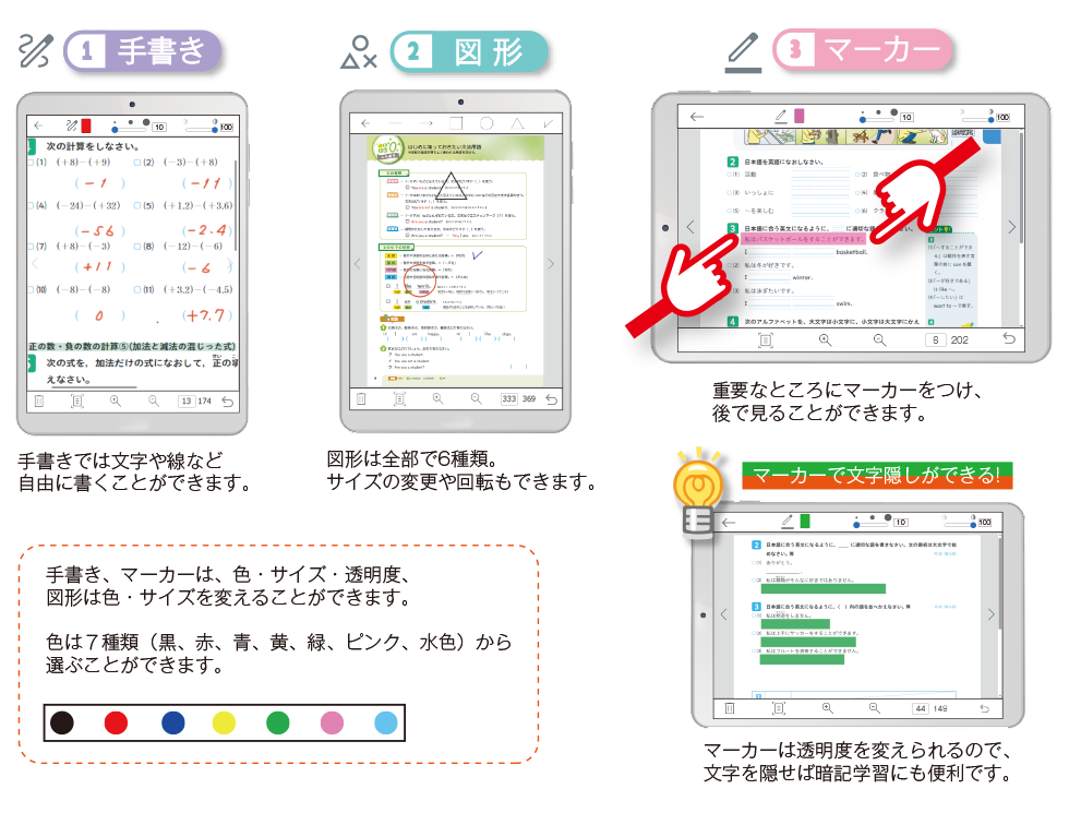 同製品では学習で書き込んだ内容がデータとして残るので、タブレット端末を利用した学習に適している。教科書準拠教材のデジタル書籍のため、教科書を学校に置いたままでの家庭学習や海外など遠隔地での学習など、場所を選ばずに教科書の内容を学べる。