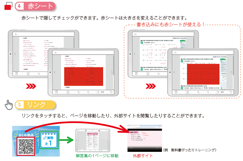さらに、すぐに使えるシンプルなメニューレイアウトと操作性のよいデザイン、直感的に理解しやすいアイコンを採用する。赤シートやリンクといったワークブックの学習シーンにマッチした機能を搭載し、学習する中学生たちの意欲を幅広くサポートする。