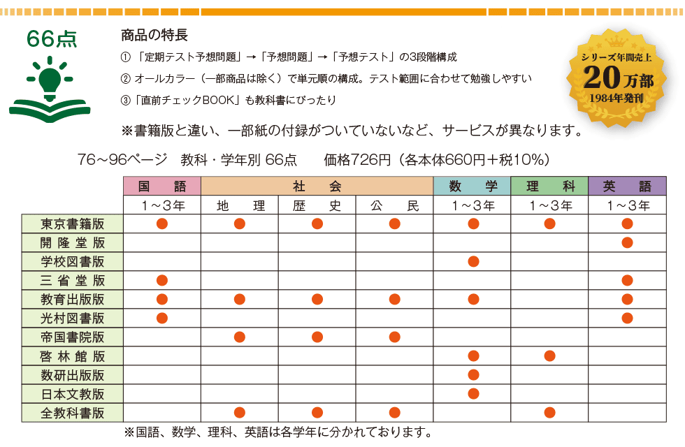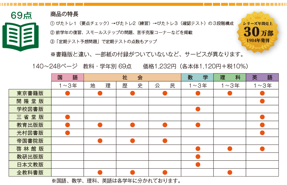 販売数は『教科書ぴったりトレーニング』が69冊、『定期テスト ズバリよくでる』が66冊の計135冊となり、国語、地理、歴史、公民、数学、理科、英語のワークブックを用意する。