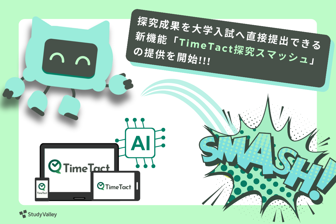 Study Valleyは、高校生による探究学習の成果や活動ログを、同社の探究学習プラットフォーム「TimeTact」から大学入試の出願資料として提出できるサービス「TimeTact探究スマッシュ」を11月25日に開始した。