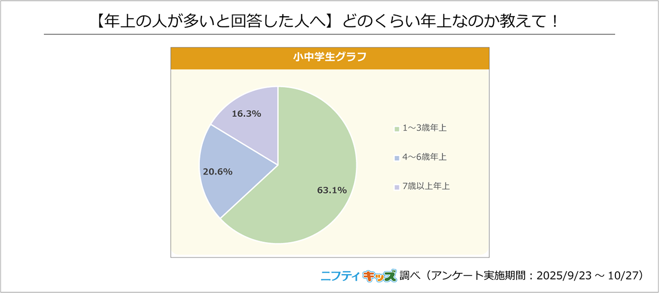 ネッ友について「年上の人が多い」と答えた人に、どのくらい年上なのかを尋ねたところ、「1〜3歳年上」が6割超で最多となった。さらに、「7歳以上年上」のネッ友がいる人も一定数みられる。