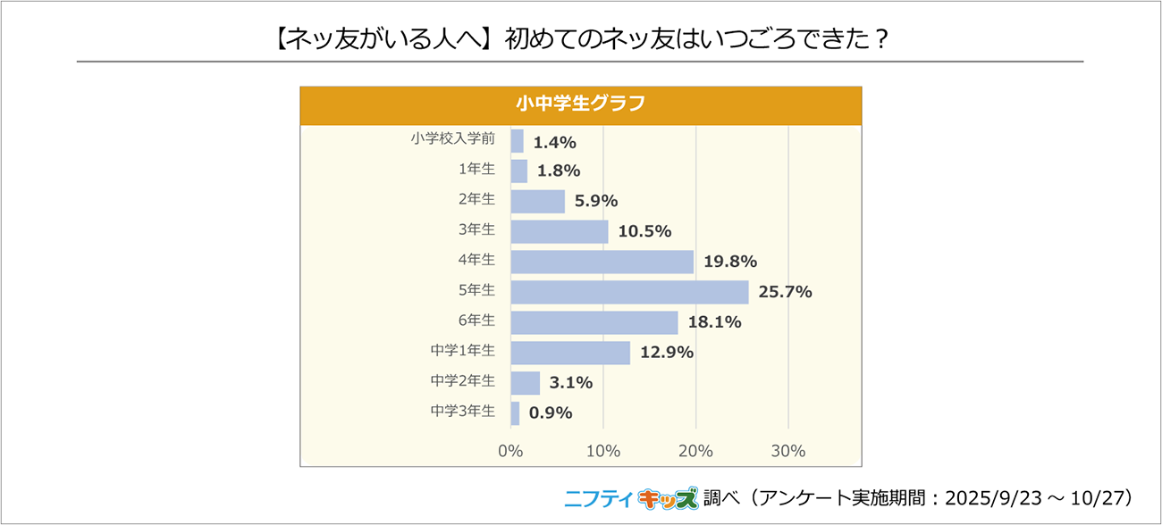 ネッ友がいる人に、はじめてネッ友ができた時期を尋ねたところ、「小学校5年生」がもっとも多い。以下、「小学校4年生」「小学校6年生」が続いている。