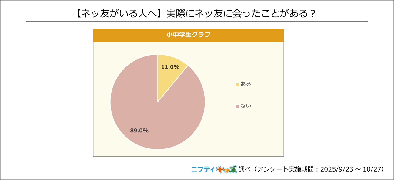 ニフティは、同社の運営する子ども向けサイト「ニフティキッズ」において、小中学生を中心とした子どもたちを対象に実施した、「ネッ友」に関するアンケート調査の結果を11月27日に発表した。同調査は、9月23日〜10月27日の期間に行われ、1664件の有効回答を得ている。