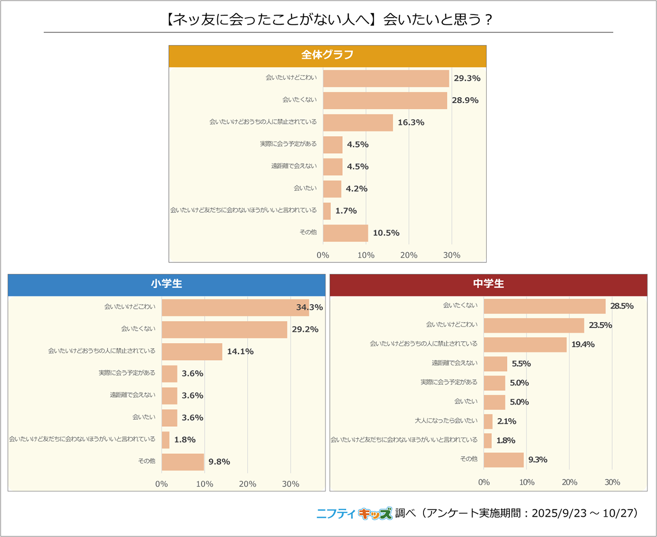 ネッ友に会ったことが「ない」と答えた人を対象とした、ネッ友に会いたいと思うかという質問では、小学生・中学生ともに「会いたくない」「会いたいけど怖い」を挙げる回答が多い。また、小学生・中学生ともに「会いたいけどおうちの人に禁止されている」という回答が上位にランクインした。「その他」の回答には、「ネッ友が住んでいる地域が遠いから難しい」「大人になったらいつか『会いたい』って誘いたい」「声や顔を知ってからなら会ってみたい」といった意見も寄せられている。
