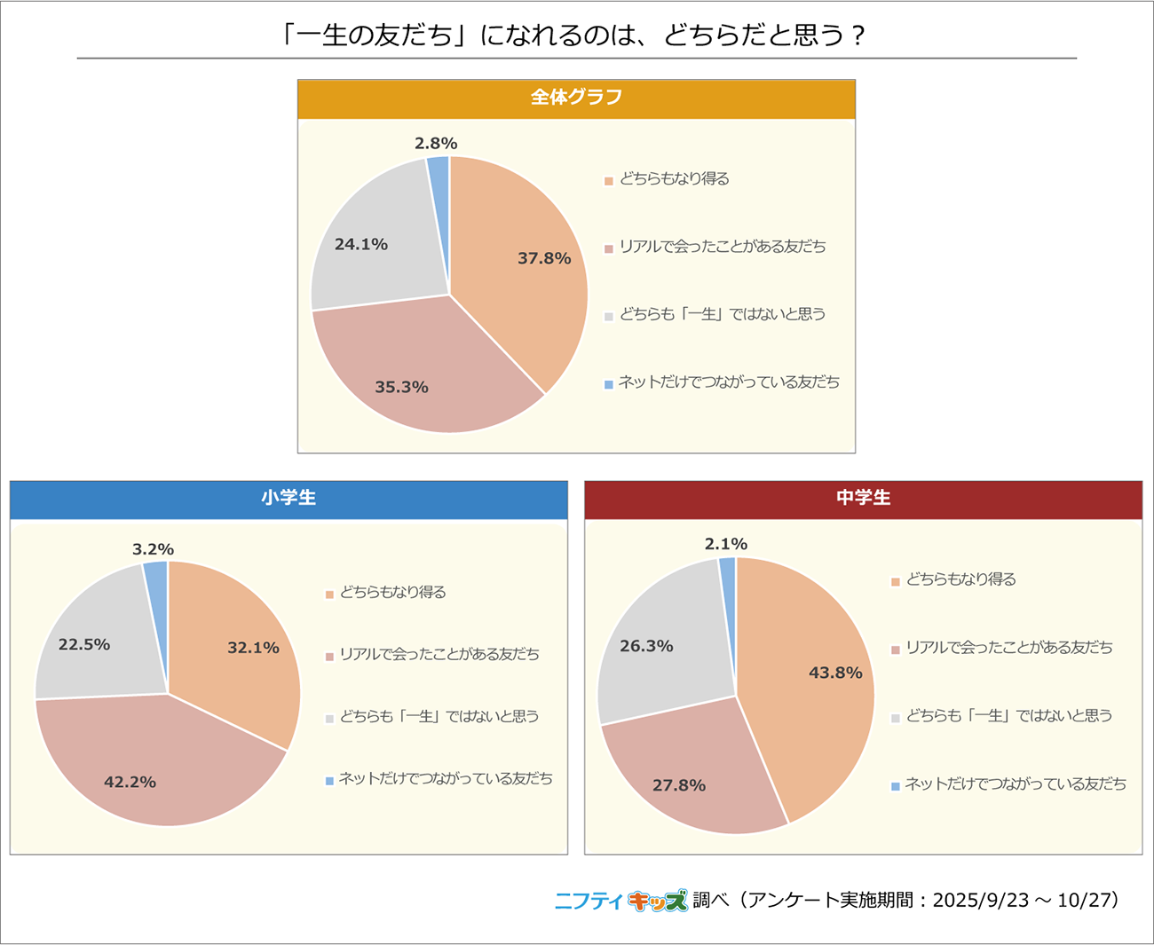 「一生の友だち」になれるのは、「リアルで会ったことがある友だち」とネッ友のどちらだと思うかを尋ねたところ、小学生では「リアルで会ったことがある友だち」が最多となり、「どちらもなり得る」を上回った。一方、中学生では「どちらもなり得る」がもっとも多い。