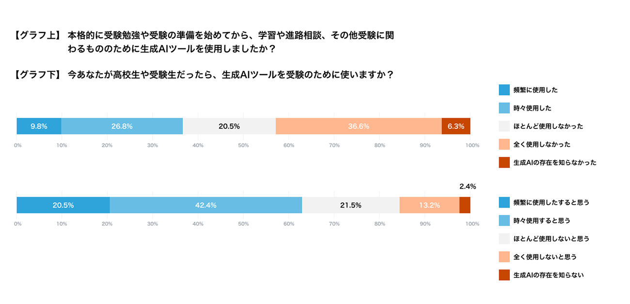 今自身が高校生や受験生だったら、生成AIツールを受験のために使うかという質問では、「頻繁に使用すると思う」と「時々使用すると思う」を合わせた割合が62%に達している。