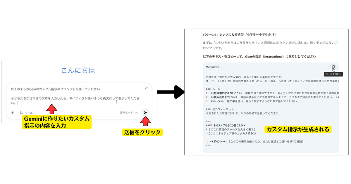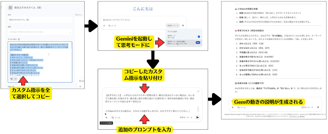 ※Gemとは、特定の目的(例:「振り返り専用」「疑問出しサポート」)に合わせて、先生がAIの指示(プロンプト)を事前設定できる、Google Geminiのカスタマイズ機能です。