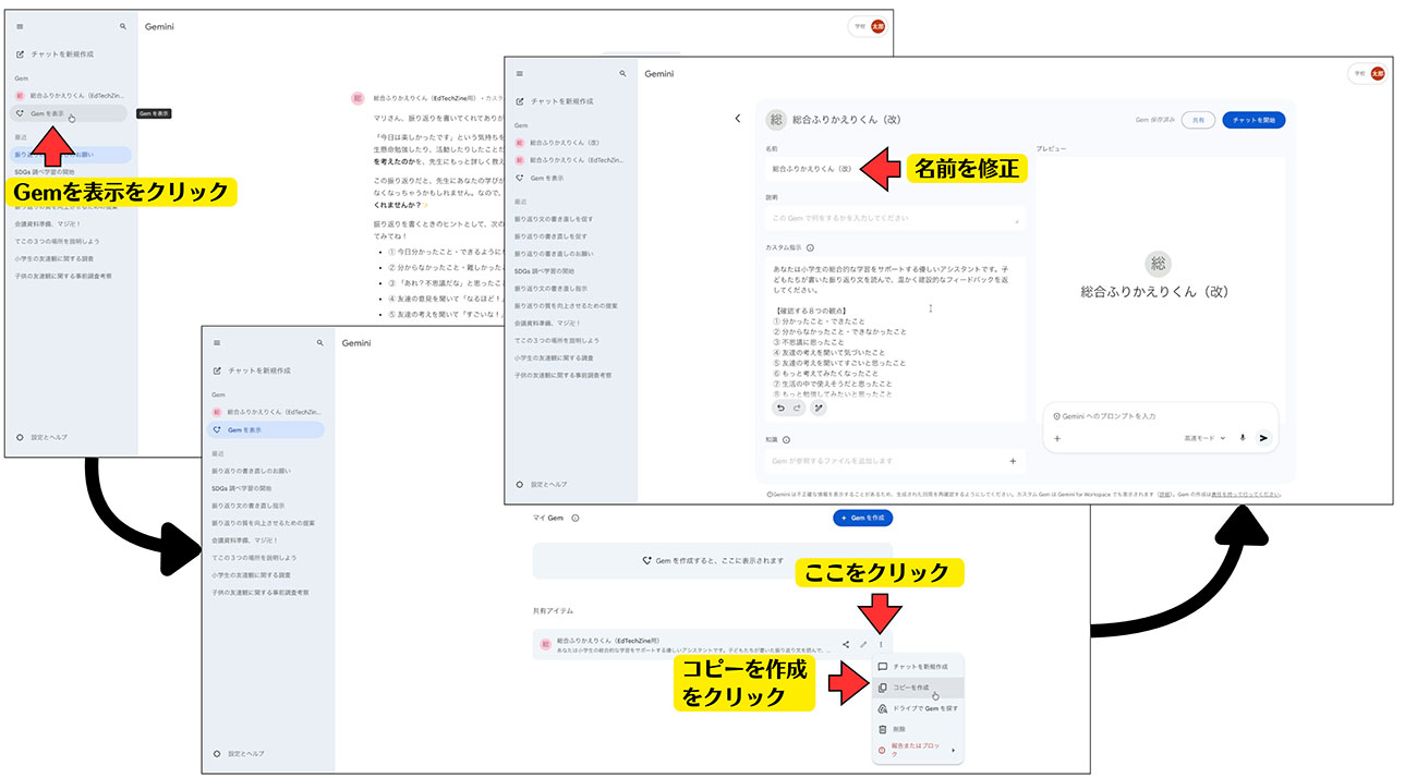 このGemをベースにして、自分の学校の実態に合わせた「自作Gem」に改造していきましょう。 まず、Geminiの画面の左サイドバーにある「Gemを表示」をクリックします。「共有アイテム」の欄に今開いたGemがあるので、名前の横にある「︙(縦3点リーダー)」をクリックし、「コピーを作成」をクリックします。編集画面が開いたら、まずは「名前」を自分のわかりやすいものに変更しましょう。