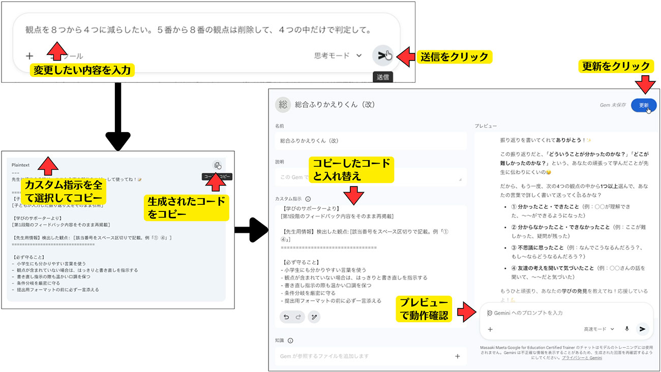 生成されたコードをコピーしたら、先ほどのGem編集画面に戻り、「カスタム指示」の欄をすべて削除してコピーしたコードを貼り付けます。プレビュー画面で振り返りを入力して、観点が4つに変わっているか試してみましょう。問題なければ「更新」をクリックして作業完了です。