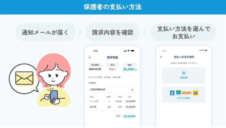 保護者はメールや連絡ツールアプリを通じて通知を受け取り、請求内容を確認し、スクペイ上でそのまま支払いができる。銀行口座を設定することで銀行即時決済が可能となり、コンビニ支払いを選択した場合は現金での支払いも利用できる。これにより、学校指定の銀行の口座開設や現金持参などの必要がなくなり、普段利用している口座とスマホやPCなどの端末があれば、自宅から支払いを完了できる。2025年12月現在、銀行口座の接続数は約380行である。