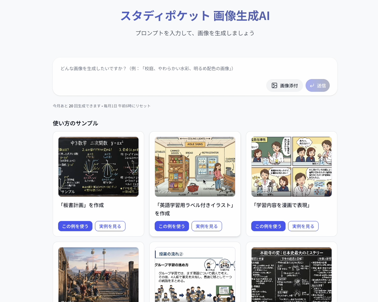 また同機能では「板書計画」「学習内容をマンガで表現」「スライドに添えるイラスト」「英語のラベル付き単語イラスト」といった、代表的な利用シーンごとのサンプルを多数用意する。複雑なプロンプトを覚えることなく、ICT活用に慣れていない教員でも活用を開始できる。