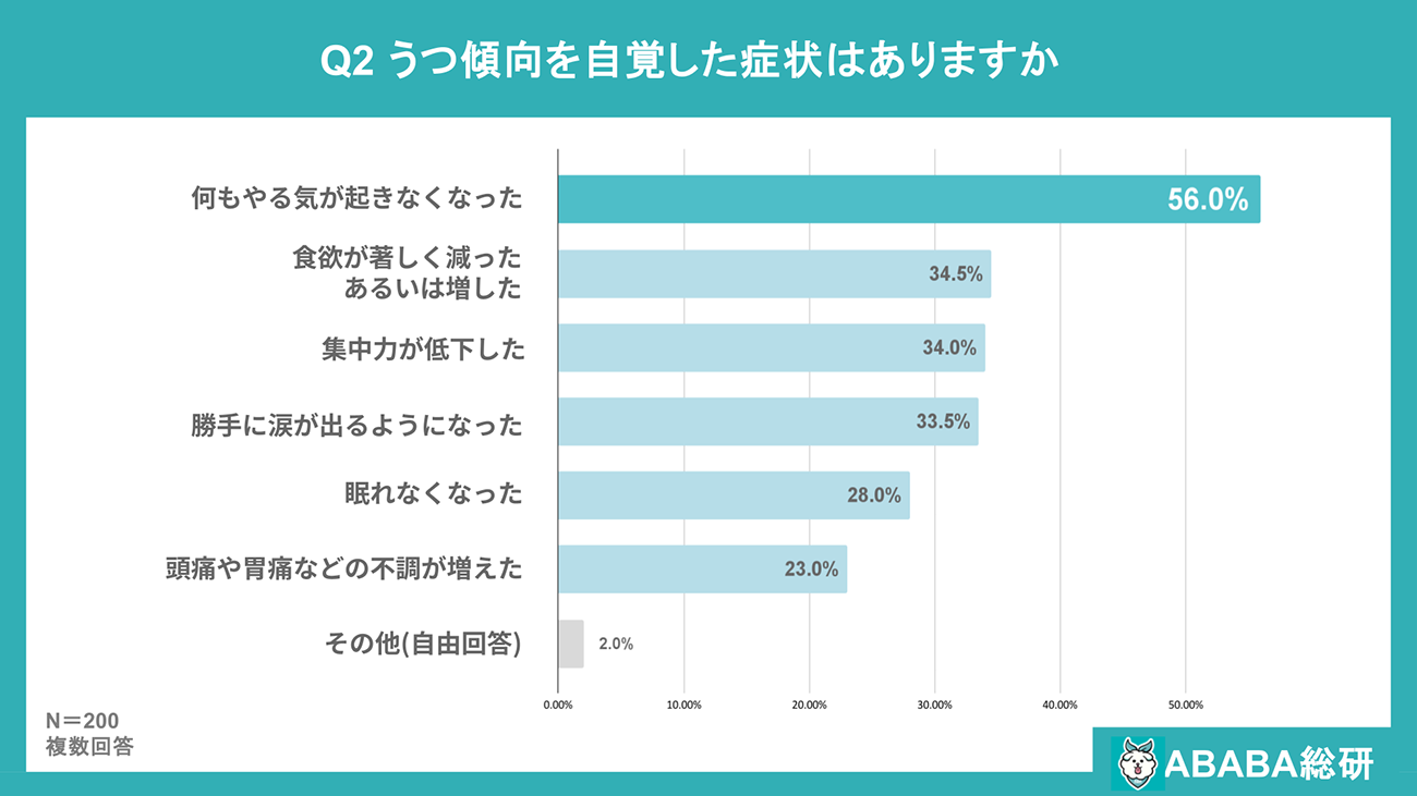 就活中にうつ傾向を自覚した症状についての質問(複数回答)では、「なにもやる気が起きなくなった」(56.0%)がもっとも多い。以下、「食欲が著しく減った、あるいは増した」(34.5%)、「集中力が低下した」(34.0%)、「勝手に涙が出るようになった」(33.5%)が続いている。また、「眠れなくなった」(28.0%)、「頭痛や胃痛などの不調が増えた」(23.0%)という、身体面への影響を訴える回答もみられた。