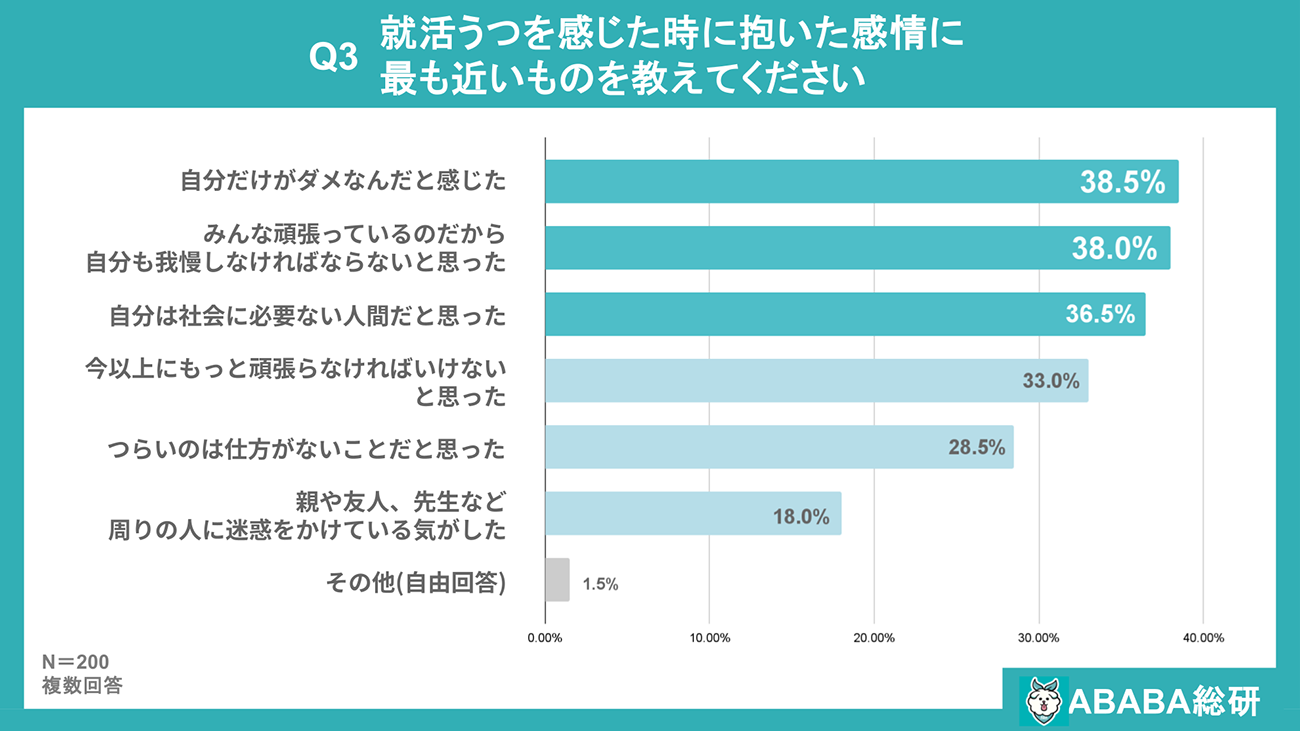 就活うつを感じたときに抱いた感情として、もっとも近いものを選んでもらったところ(複数回答)、「自分だけがダメなんだと思った」(38.5%)が最多となっている。以下、「みんながんばっているのだから、自分も我慢しなければならないと思った」(38.0%)、「自分は社会に必要ない人間だと思った」(36.5%)、「今以上にもっとがんばらなければならないと思った」(33.0%)、「つらいのは仕方がないことだと思った」(28.5%)が続いている。