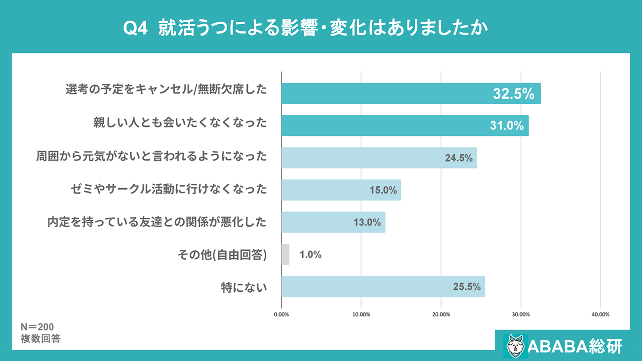 就活うつによる影響・変化についての質問(複数回答)では、「選考の予定をキャンセル/無断欠席した」(32.5%)がもっとも多い。「親しい人とも会いたくなくなった」(31.0%)、「周囲から元気がないと言われるようになった」(24.5%)、「ゼミやサークル活動にも行けなくなった」(15.0%)がそれに続いた。